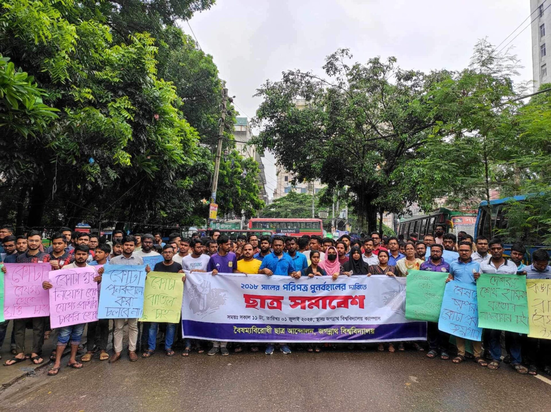 ২০১৮ সারের জারিকৃত (কোটা ব্যাবস্থা বাতিল) পরিপত্র পুনর্বহালের দাবিতে ছাত্র সমাবেশ করেছে জগন্নাথ বিশ্ববিদ্যালয়ের সাধারণ শিক্ষার্থীরা। সেই সঙ্গে কোটা পথা বাতিলে ৪ দফা দাবি ঘোষণা করেছে আন্দোলনরত শিক্ষার্থীরা।