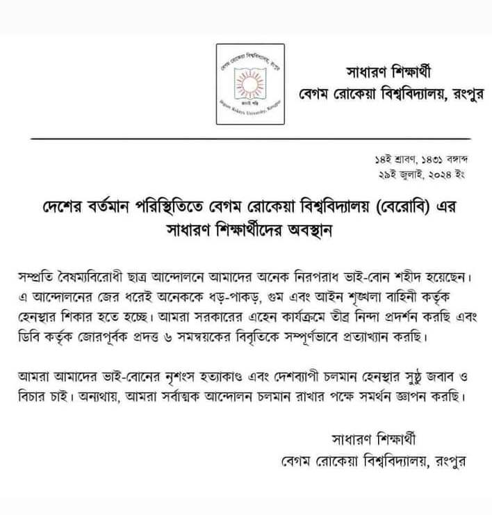 গত কাল (১৬ জুলাই) দুপুর ৩টার দিকে রংপুরের খামার মোড় থেকে শিক্ষার্থীরা বিশাল মিছিল নিয়ে বিশ্ববিদ্যালয়ের ১নং ফটকের সামনে আসেন। এ সময় তারা বিভিন্ন স্লোগান দিতে থাকেন। শিক্ষার্থীরা ক্যাম্পাসে প্রবেশের চেষ্টা করলে পুলিশ বাধা দেয়। এতে পুলিশের সঙ্গে শিক্ষার্থীদের সংঘর্ষ বাধে। এ সময় পুলিশ প্রায় ২০০ রাউন্ড গুলি ও রাবার বুলেট ছোড়ে। এ সময় পুলিশের গুলিতে বিশ্ববিদ্যালয়ের ইংরেজি বিভাগের শিক্ষার্থী আবু সাইদ নিহত হন।